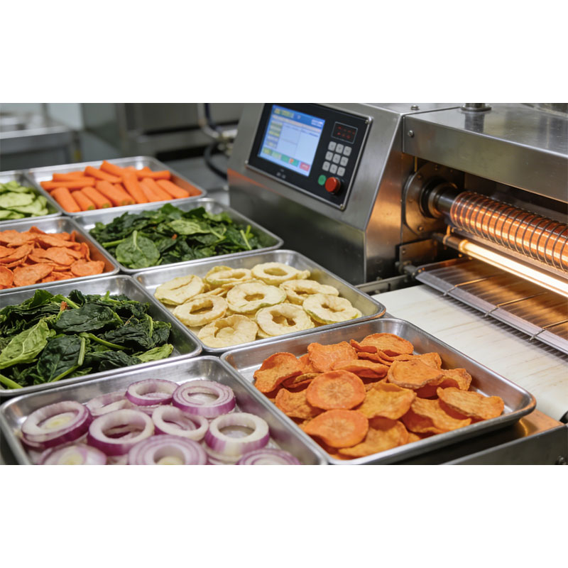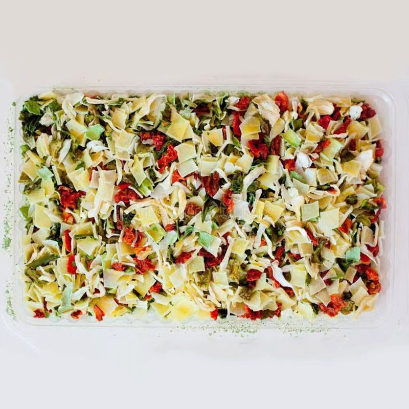 Прием овощного сырья→Хранение сырья→Предварительная обработка→Мойка→Нарезка→Сушка→Охлаждение→Удаление примесей→Сортировка по цвету→Ручная сортировка→Металлодетекция→Упаковка и складирование→Хранение готовой продукции